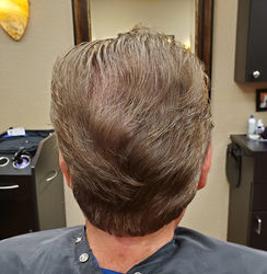 John asked for his monthly haircut. He has thick wavy hair with several cowlicks. That I have found a way to tame his hair so it's easy for him to manage it. His dog Chewy is great fun!